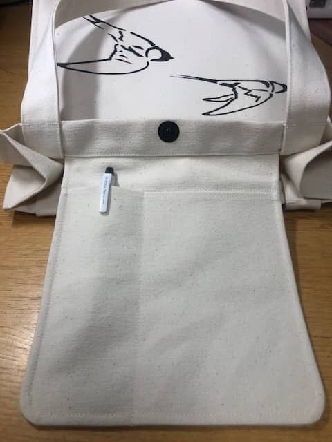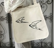 ツバメの可愛らしいプリントが印象的な、ナチュラルな帆布素材のバッグです。